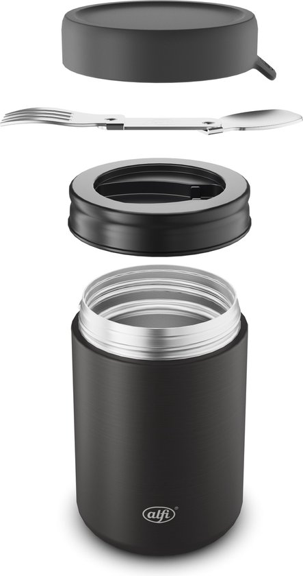 Iso Food Mug in matte trendy stijl: Het to-go accessoire van alfi® houdt zelfgemaakte maaltijden tot 5 uur warm of tot 10 uur gekoeld. En het heeft nog een geweldige extra te bieden: een praktische vork en lepel combinatie - de lepel is geïntegreerd in het deksel voor gemakkelijke toegang. Dankzij de hoogwaardige roestvrijstalen behuizing van 0,35 liter en het siliconen deksel transporteert de ISO FOOD MUG al het voedsel betrouwbaar en absoluut lekvrij.