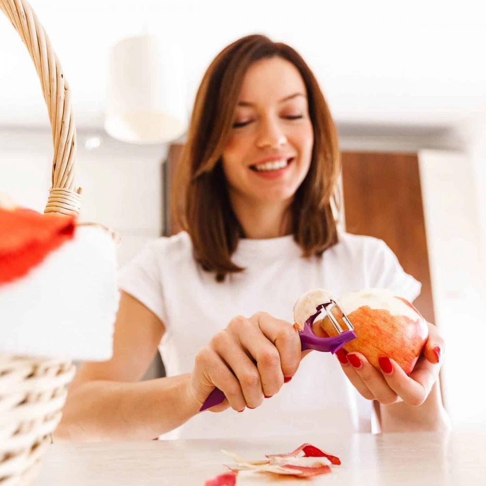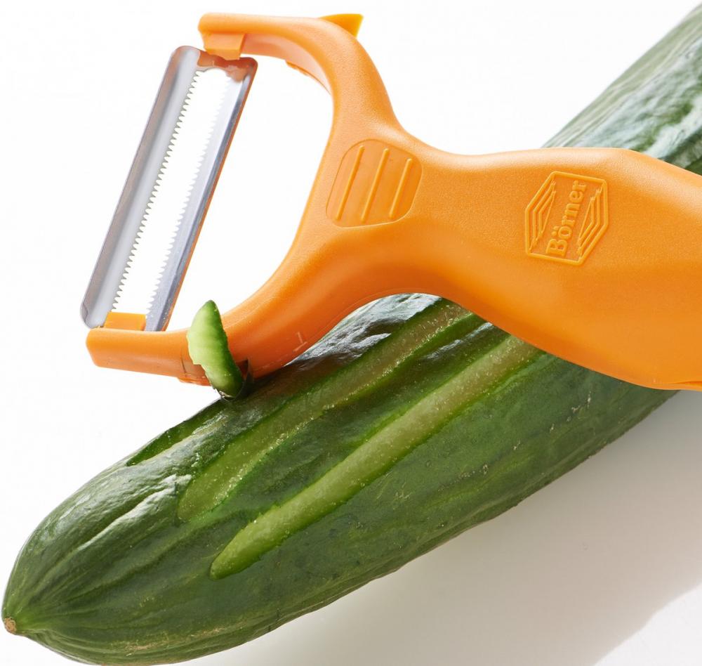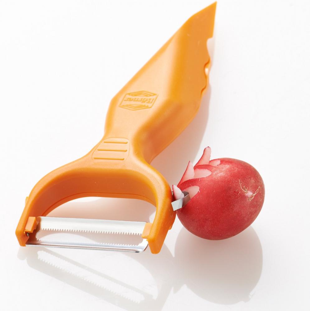 - Een mesje dat in beide richtingen snijdt, voor het schillen van allerlei groenten en fruit, zoals wortelen, asperges en aardappelen. Door de getande mesjes is dit apparaatje ook geschikt voor het schillen van tomaten en paprika.