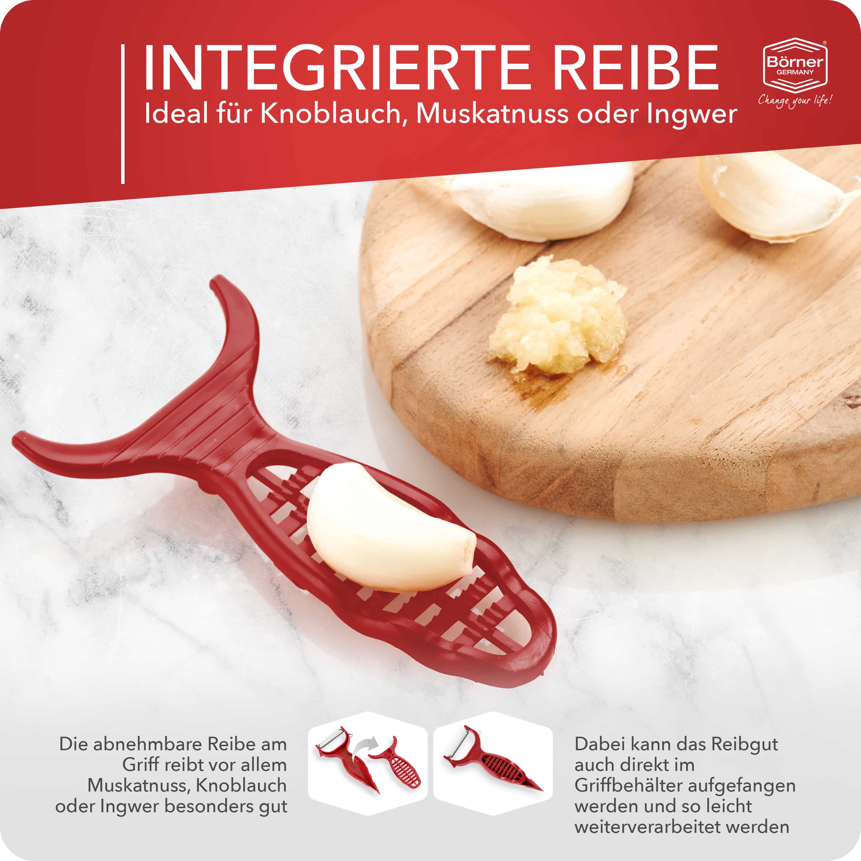 - Ingebouwde rasp in de handgreep, ideaal voor knoflook, gember en nootmuskaat