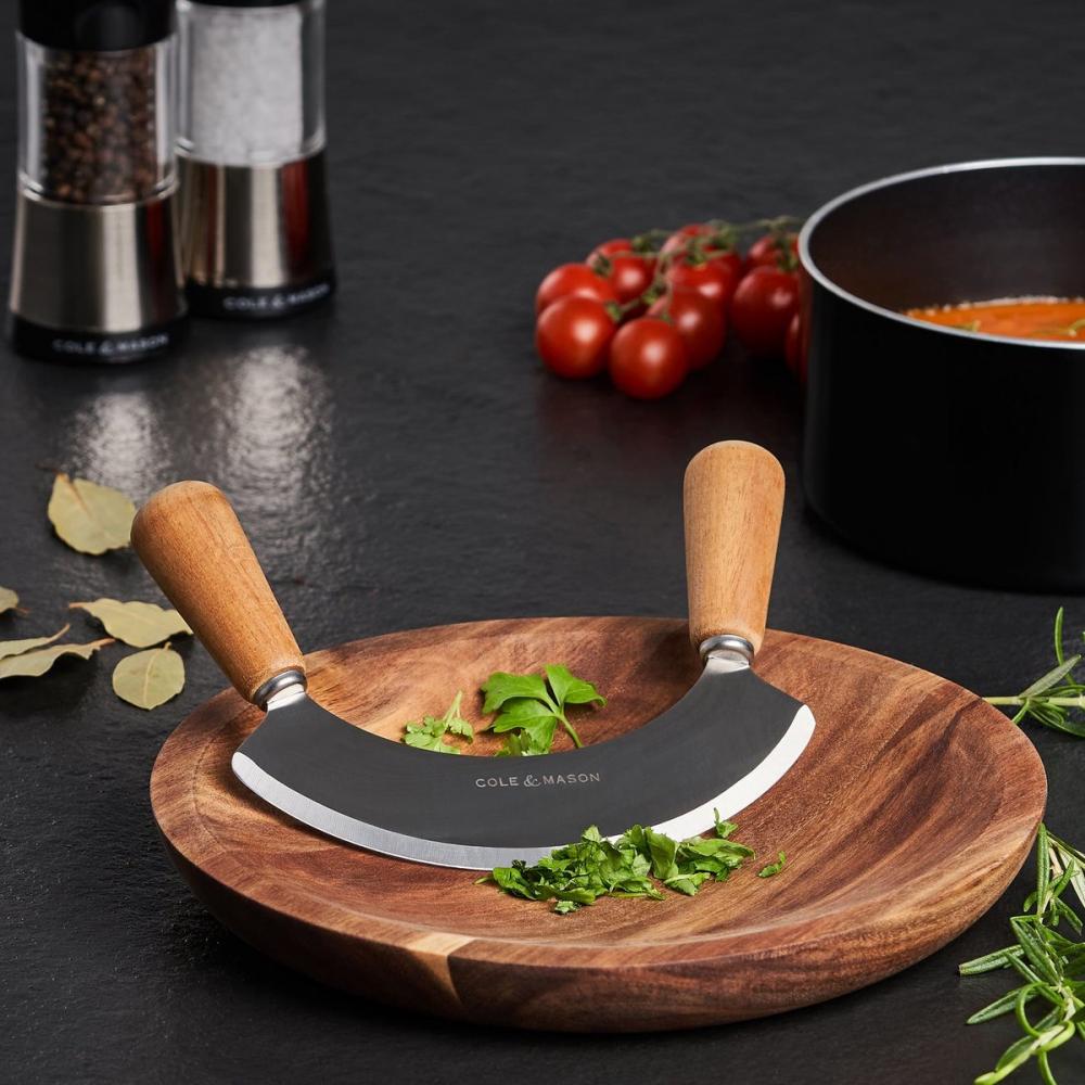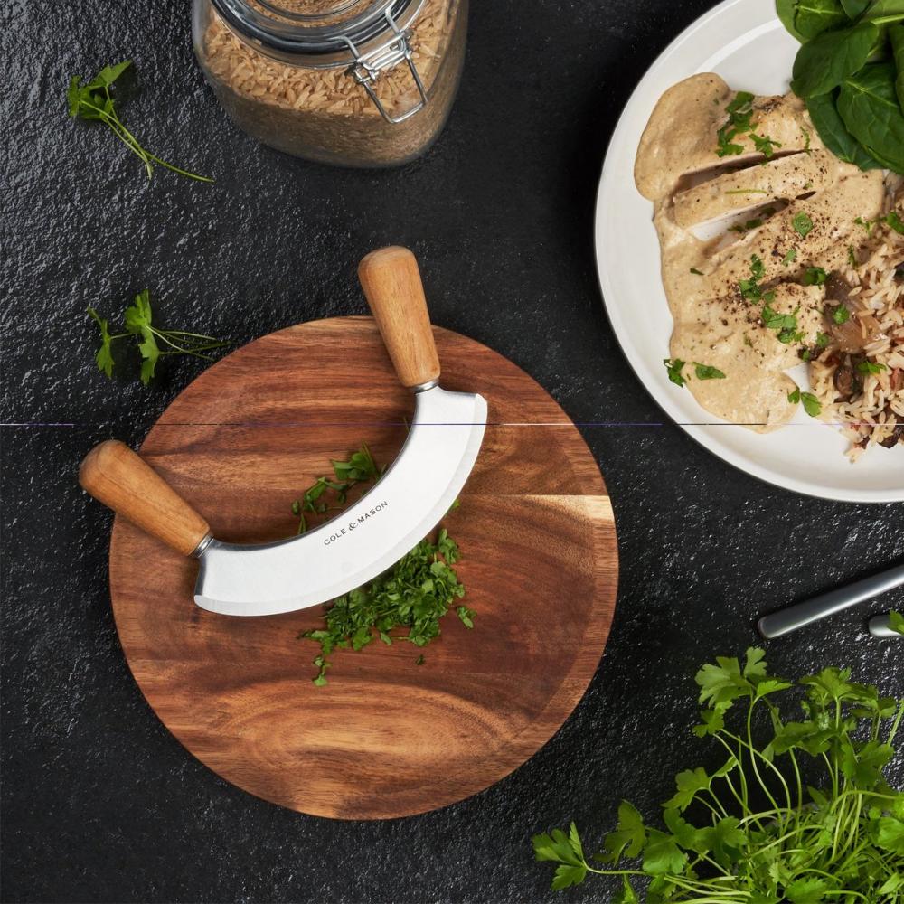Het wiegemes en bijpassende snijplank van Cole&Mason zijn ideaal voor het fijnhakken van verse kruiden en look. De massief houten plank in acacia heeft een geolied oppervlak en is onderhoudsvriendelijk. Acaciahout is van nature een harde en duurzame houtsoort met een mooi nervenpatroon.