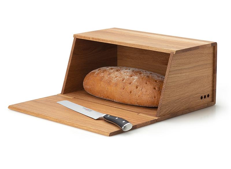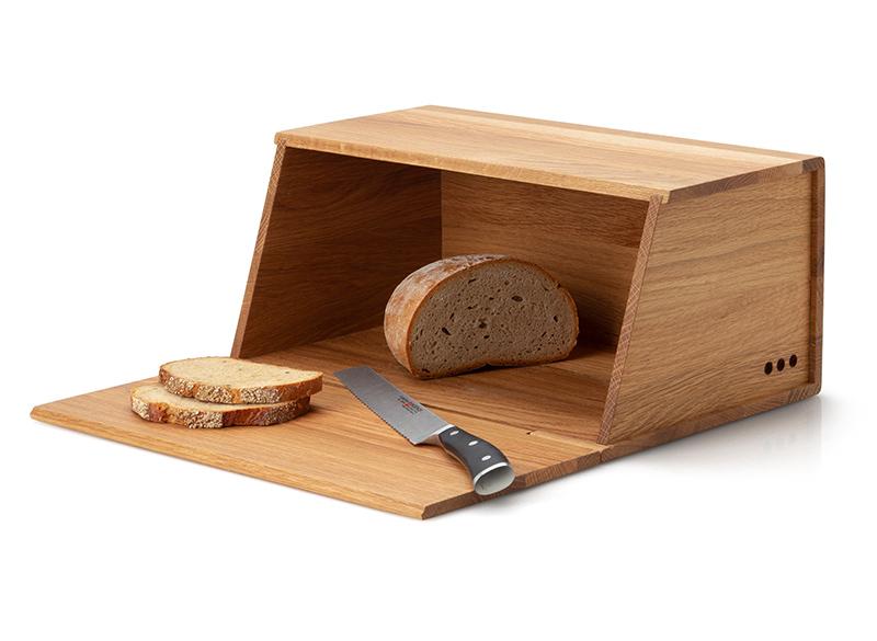 Met een strakke, moderne vormgeving en een hoogwaardige afwerking is deze massief houten broodtrommel in eiken een blikvanger in je keuken. Het neerklappend deksel kan je gebruiken als broodplank om je brood op te snijden. Het compact ontwerp spaart plaats op je aanrecht en op het rechte bovenvlak kan je probleemloos nog een aantal voorraadpotten of andere keukentools kwijt. In de zijwanden van de trommel zijn verluchtingsopeningen voorzien. Het geoliede oppervlak is onderhoudsvriendelijk maar behoudt het natuurlijk aspect van het hout en ontwikkelt een rijk patina met het gebruik.