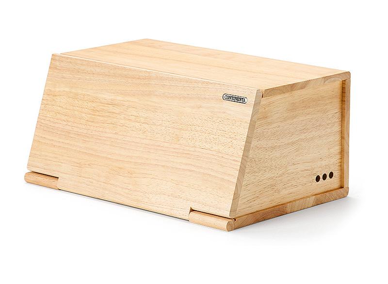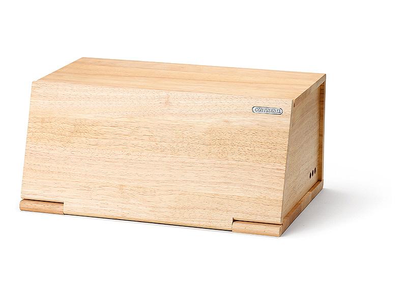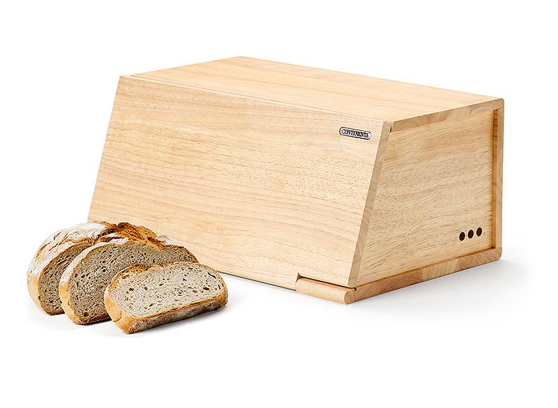 Massief houten broodtrommel in rubberwood. Het neerklappend Deksel kan gebruikt worden als snijplank. In de zijwanden zijn verluchtingsopeningen voorzien. De producten worden behandeld met een hardende olie, geschikt voor contact met voeding, die het hout beschermt en de antibacteriële eigenschappen ervan activeert. Continenta verwerkt enkel hout uit duurzaam beheerde bossen. Hout heeft van nature een bacteriedodende werking.