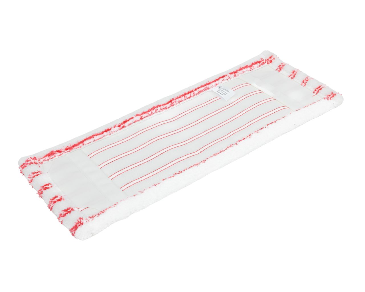 Dankzij de rode kleurcodering onderscheid je eenvoudig sanitair materiaal van andere schoonmaaktaken — ideaal binnen HACCP-richtlijnen en professionele poetsregimes. De geborstelde microvezelstructuur verwijdert vuil, kalksporen, haren en zeepresten zonder strepen én droogt supersnel. Deze mop werkt met Gleiter / velcro-bevestiging en past op alle professionele vlakmopsystemen met klittenband.