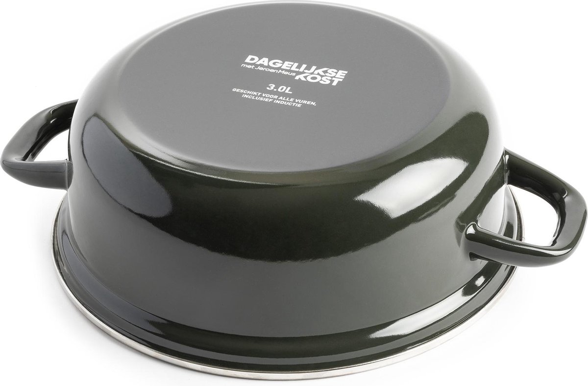 De PFAS-vrije Dagelijkse Kost Emaille Braadpan - Olijfgroen warmt snel op en houdt de warmte goed vast. Ideaal voor wie graag energiezuinig kookt! Het unieke design met verzonken deksel voorkomt dat je gerecht overkookt en de prachtige olijfgroene kleur is een blikvanger in elke keuken. Deze Dagelijkse Kost braadpannen zijn geschikt om maaltijden te bereiden voor 2 tot 3 personen. De stoofpot is ideaal om te koken, stoven, bakken of braden. Hij is ook handig om vlees dicht te schroeien en verder te laten garen in de oven.