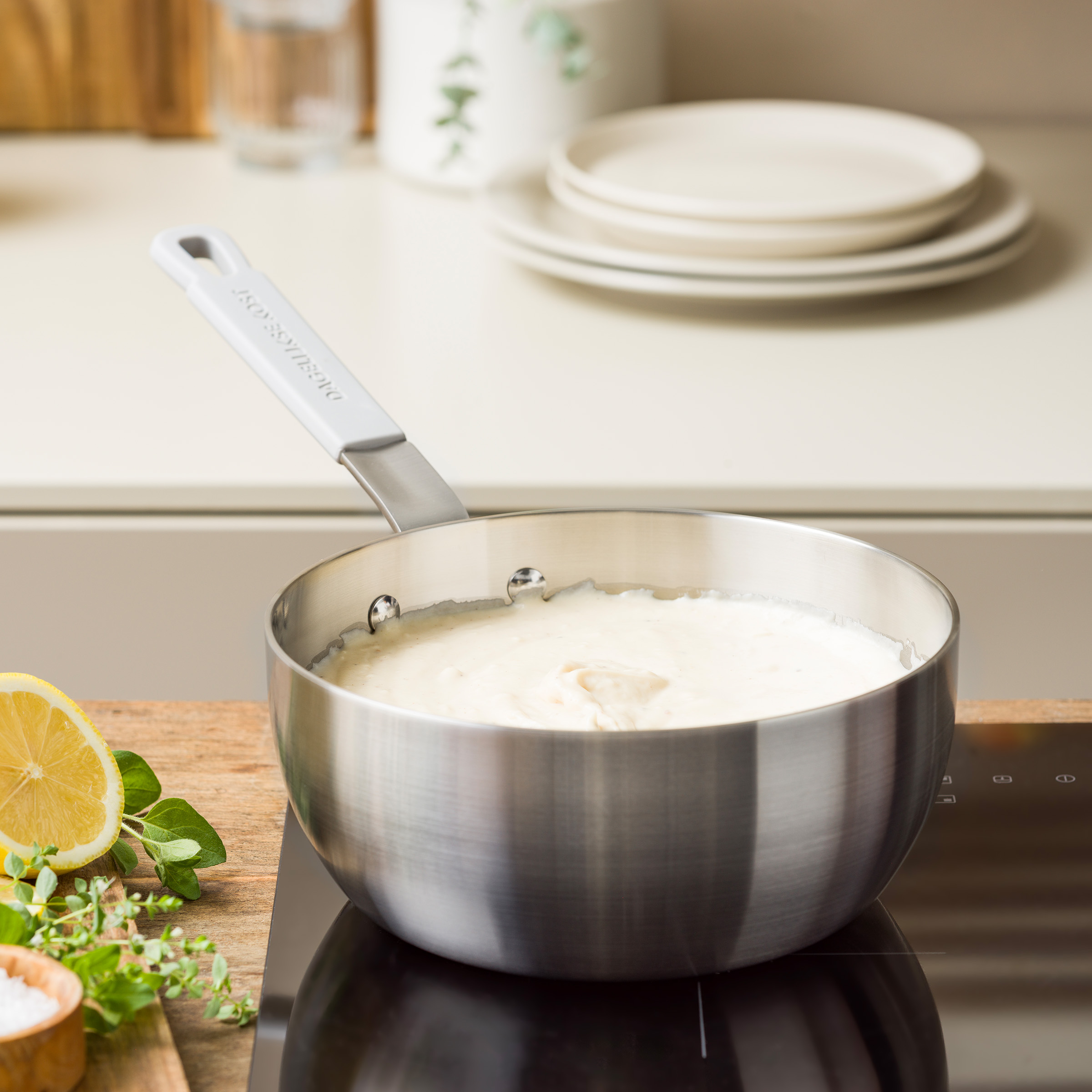 Met haar minimalistische design en extra lange handgreep met silicone cover in elegant truffelgrijs combineert deze sauspan professionele prestaties met een stijlvolle uitstraling.