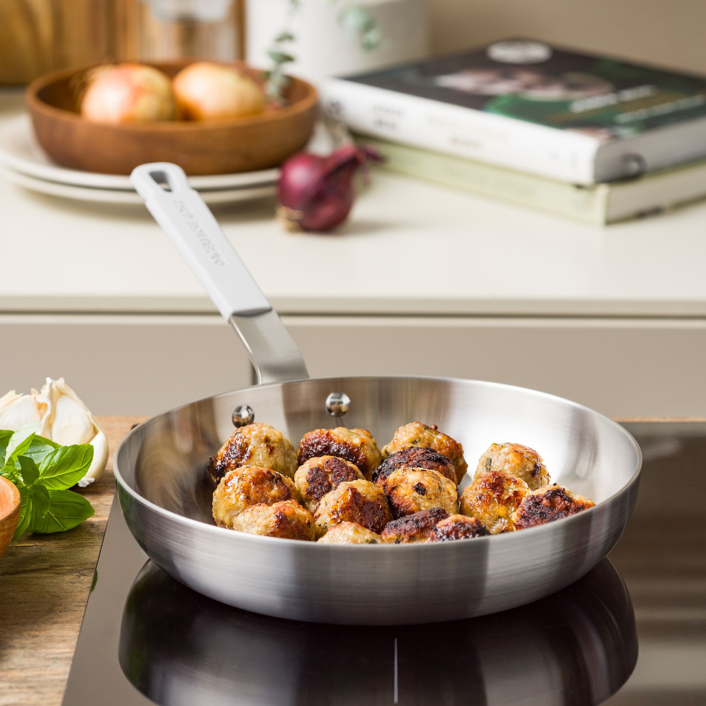 Dankzij de 3-laagse (3PLY) constructie met aluminium kern wordt de warmte snel en gelijkmatig verdeeld over de volledige pan. Geen hotspots, wel perfecte bakresultaten. Ideaal voor het bakken van vlees, vis, groenten, aardappelen en het opbouwen van rijke smaken.