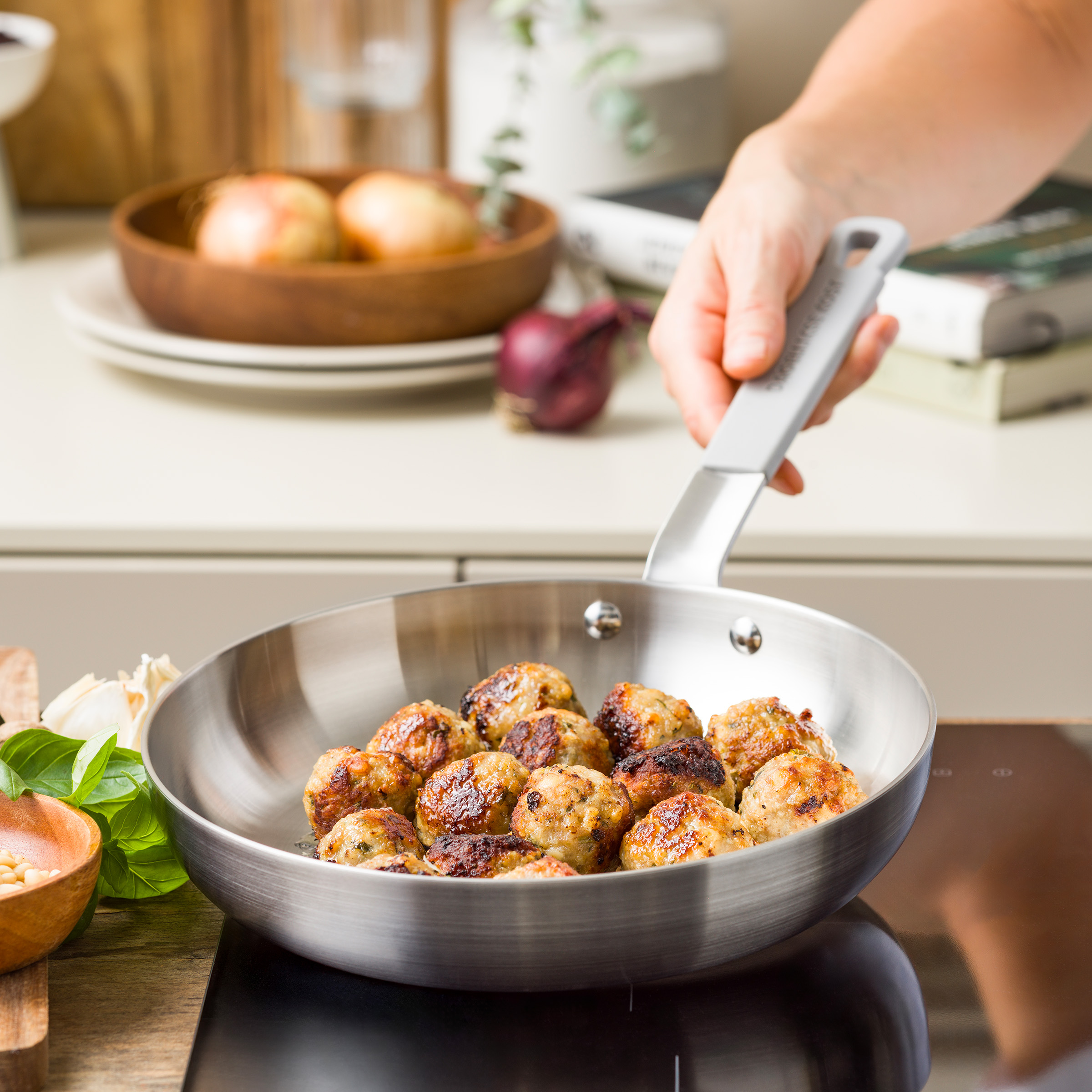 Het roestvrijstalen bakoppervlak is geschikt voor hoge temperaturen en intensieve kooktechnieken zoals dichtschroeien en karamelliseren. De pan reageert onmiddellijk op temperatuurveranderingen, waardoor je volledige controle hebt over elk gerecht.