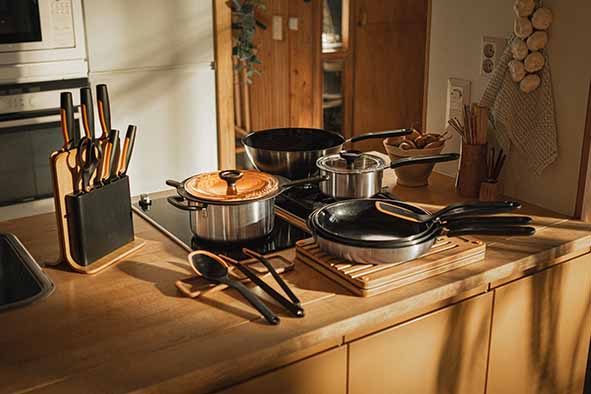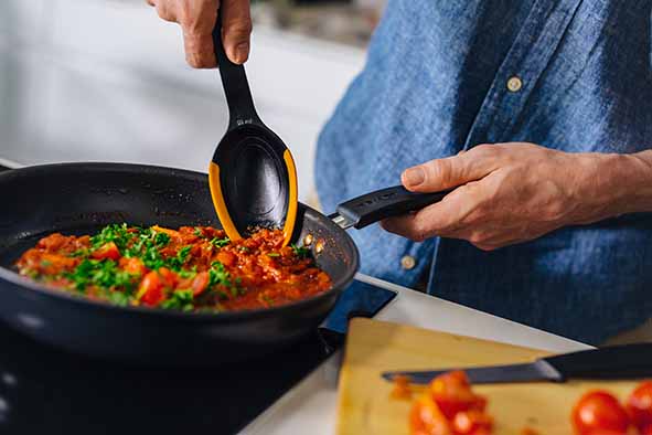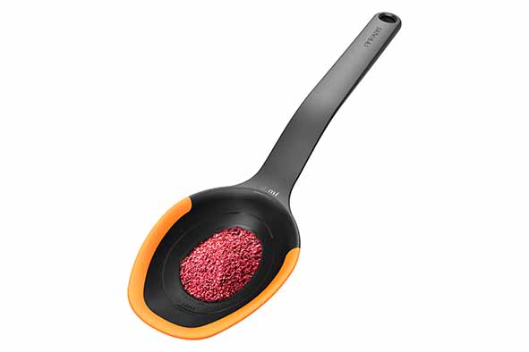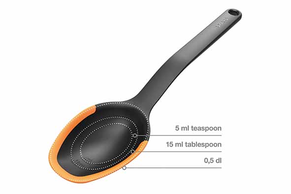Functional Form biedt gemakkelijke en eenvoudige oplossingen voor dagelijks kookgemak. Het keukengerei is dusdanig ontworpen dat het gebruiksvriendelijk is en gemakkelijk schoongemaakt en opgeborgen kan worden. Dankzij de flexibele siliconen randen kun je zelfs de laatste restjes uit de koekenpan/braadpan halen, zonder dat er krassen op de coating komen. Met geïntegreerde maataanduiding voor theelepel, eetlepel en 0,5 dl. Gemakkelijk in gebruik voor zowel rechts- als linkshandigen.