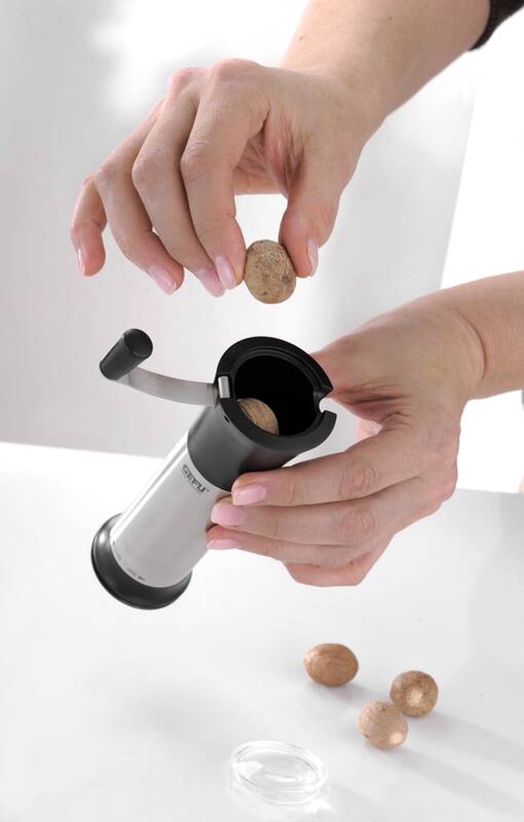 De Moscata nootmuskaatmolen is uitgerust met een Laser Cut maalwerk en maalt met gemak nootmuskaat en hazelnoten fijn. Daarnaast bevat de molen een geïntegreerd compartiment om maximaal 4 noten te bewaren. In de molen zelf kun je maximaal 1 noot tegelijk gebruiken om te malen. Wanneer je deze noot in de molen hebt geplaatst, kun je de molen dicht klikken om hem veilig te kunnen gebruiken. Dit kun je gemakkelijk zien aan de buitenkant door de woorden 'open - close'. Daarnaast is de molen voorzien van een dekseltje om de smaak te behouden en de tafel schoon te houden. Om ruimte te besparen, kun je de hendel eenvoudig inklappen.