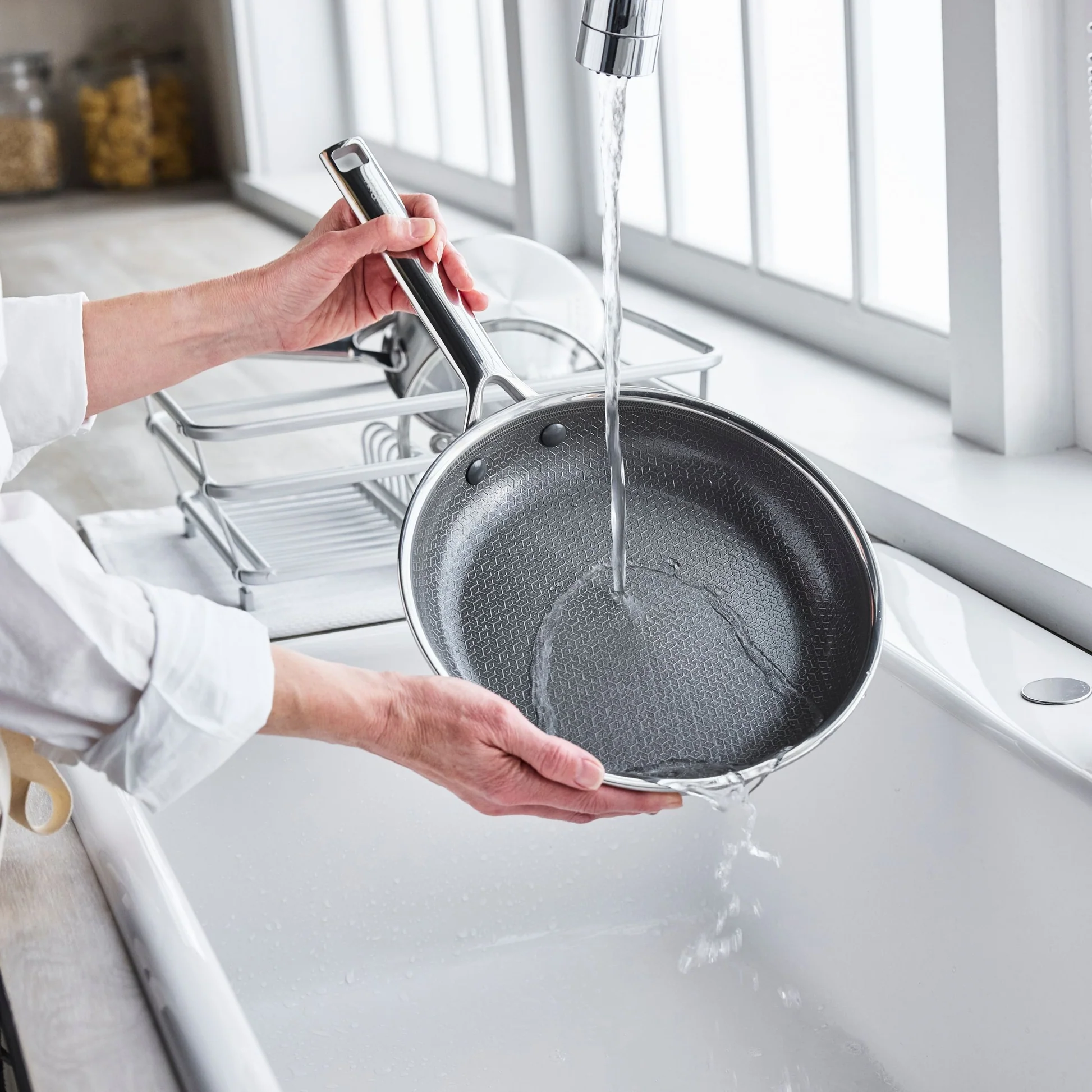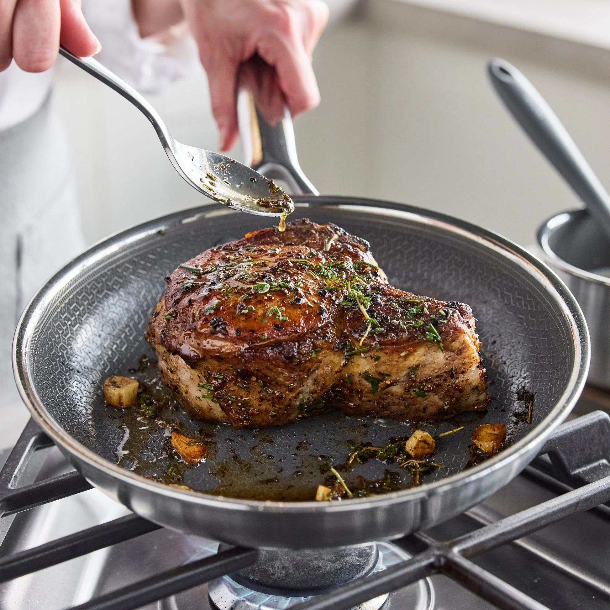 Dankzij het geëtste Thermobond Hybrid-patroon in hoogwaardig roestvrij staal geniet je van het beste van twee werelden: de intense schroeikracht van RVS én de makkelijk schoon te maken antiaanbaklaag van GreenPan – volledig PFAS-vrij.