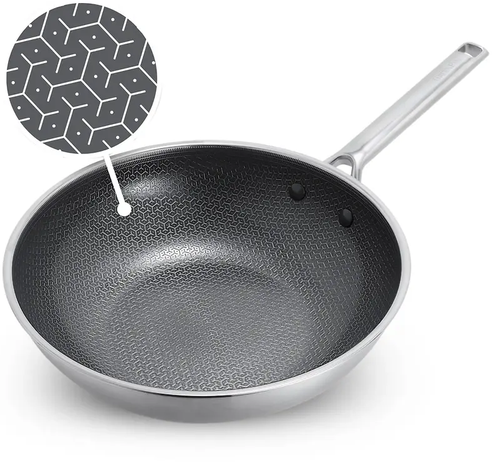 Het geëtste Thermobond Hybrid-patroon zorgt voor perfecte balans tussen intense schroeikracht en moeiteloze loslating, zodat je gerechten niet aanbakken maar wel dat heerlijke wokaroma krijgen. Dankzij de 3-laags RVS-constructie wordt de warmte snel en gelijkmatig verdeeld, ideaal voor het wokken van groenten, vlees en noedels.