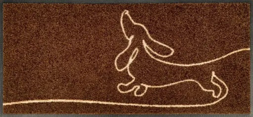 De Kleen-Tex Wash+Dry deurmat Daydreamer is een charmante donkerbruine mat met een beige teckel tekening – perfect voor hondenliefhebbers en iedereen die zijn inkom een gezellige, persoonlijke toets wil geven.