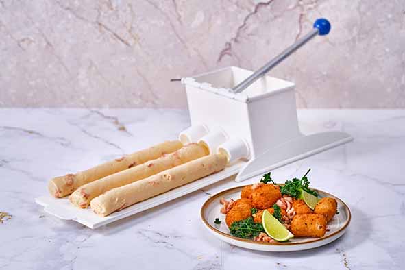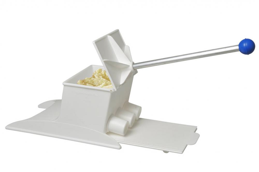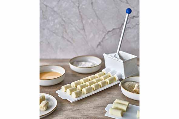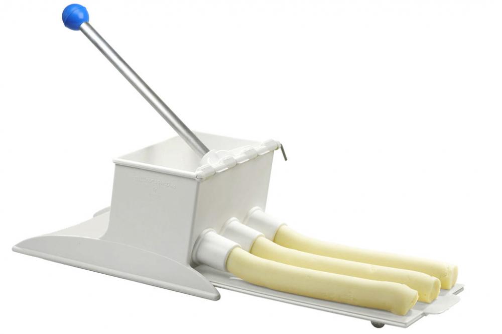 Voor perfect gevormde, zelfgemaakte kroketten gebruik je de Millecroquettes krokettenmachine. Het apparaat is eenvoudig te gebruiken en ook gemakkelijk te reinigen. Je vult het reservoir met warme aardappelpuree en met behulp van de hendel duw je de puree door de spuitmonden. Je gebruikt het meegeleverde oplegplankje om de pureecilinders op te vangen en te laten afkoelen. Naast klassieke aardappelkroketten, kan je de Millecroquettes ook perfect gebruiken voor het bereiden van garnaal- en kaaskroketten, viskroketten of zelfs bitterballen.