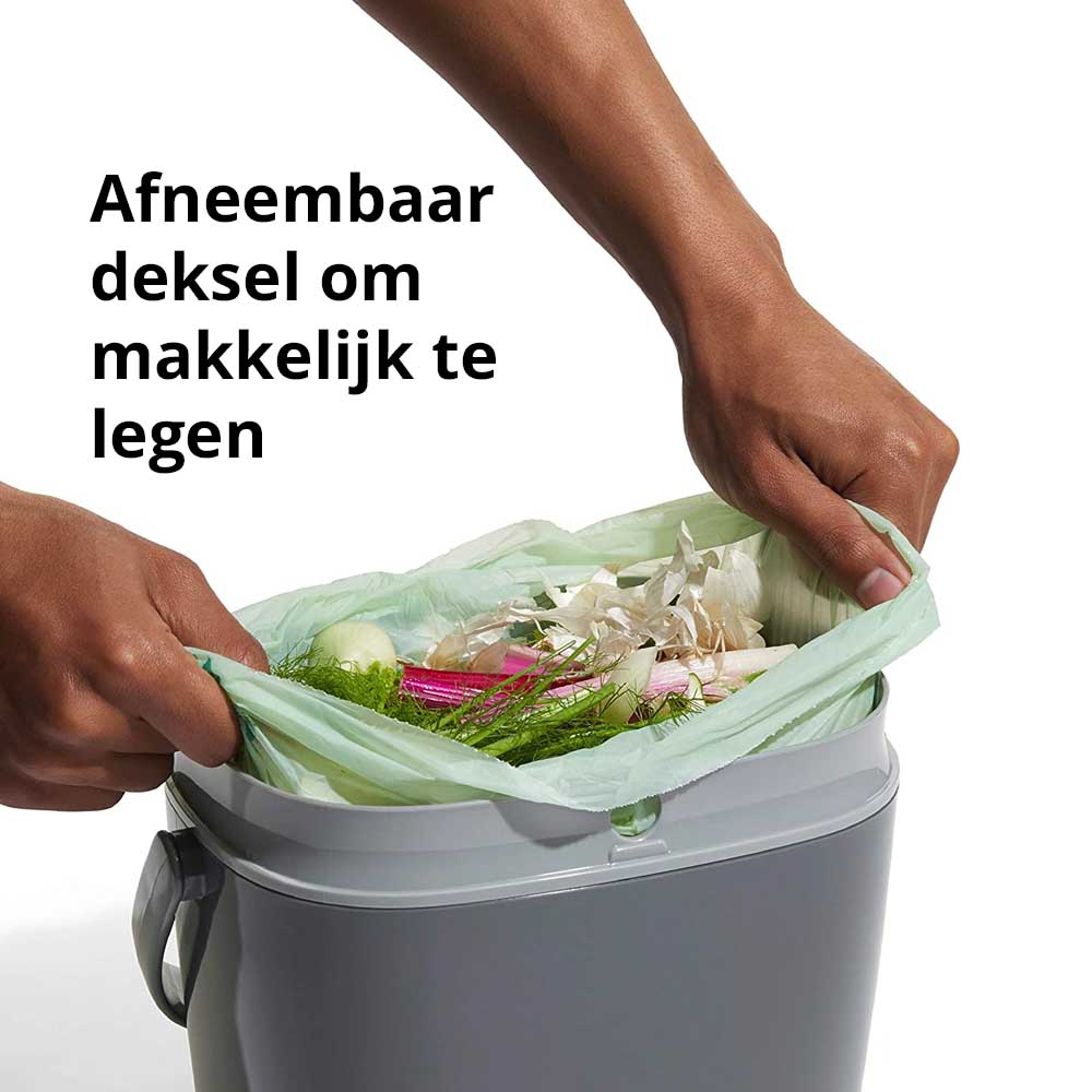 De compostemmer is voorzien van een afneembaar deksel dat je met één hand opent, een stevig hengsel voor eenvoudig legen en een gladde binnenkant die snel schoon te maken is. Je kunt hem gebruiken met of zonder compostzak. Dankzij de slimme randbevestiging werk je een zakje onzichtbaar weg.