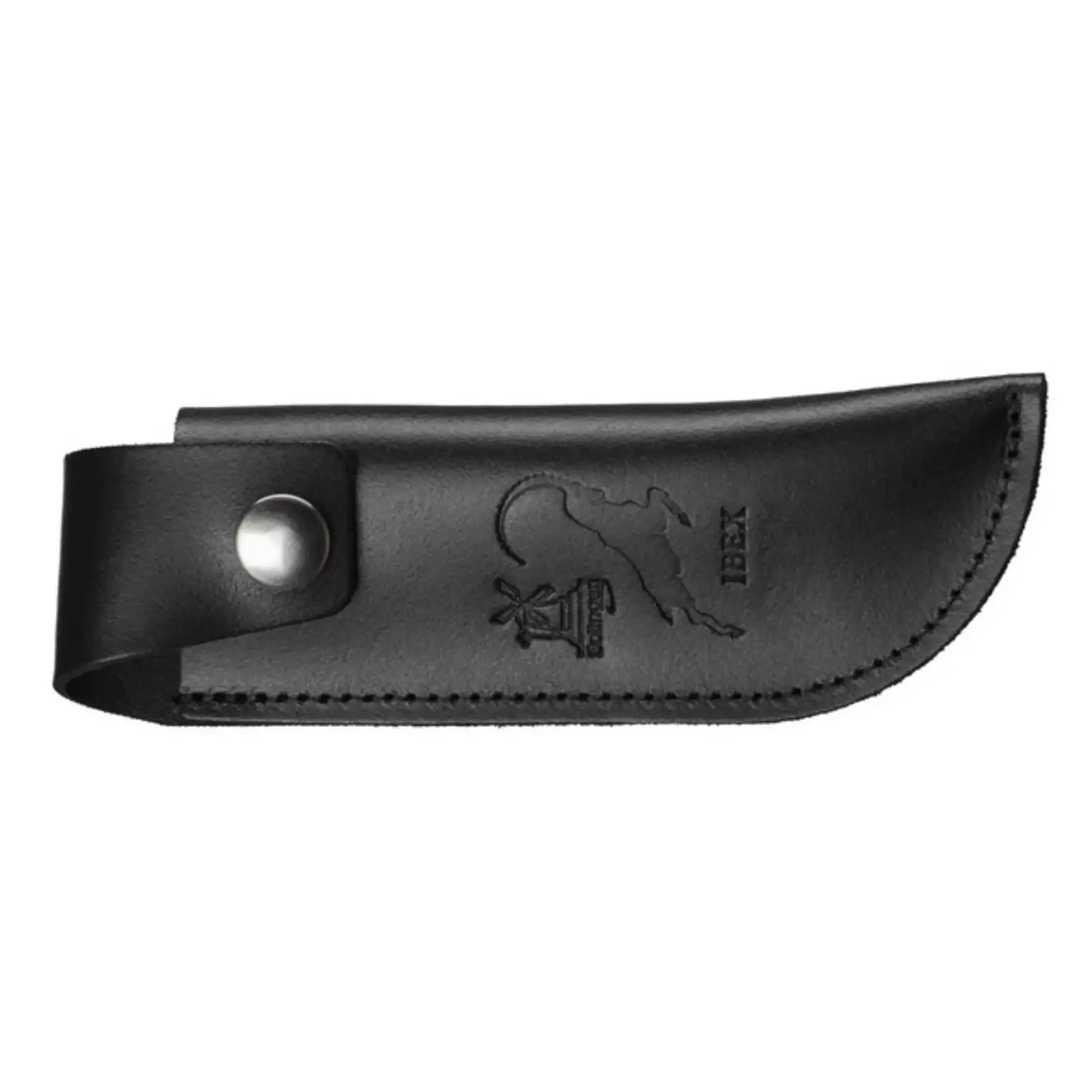 De schede is vervaardigd uit hoogwaardig zwart gelooid leer, dat niet alleen beschermt tegen slijtage en beschadigingen, maar ook een elegante, tijdloze uitstraling heeft. Het leer is dik en soepel tegelijk, bestand tegen intensief gebruik en afgewerkt met het herkenbare IBEX-logo in reliëf op de voorzijde. De stevige metalen drukknoop houdt het mes veilig op zijn plaats, zelfs tijdens beweging.