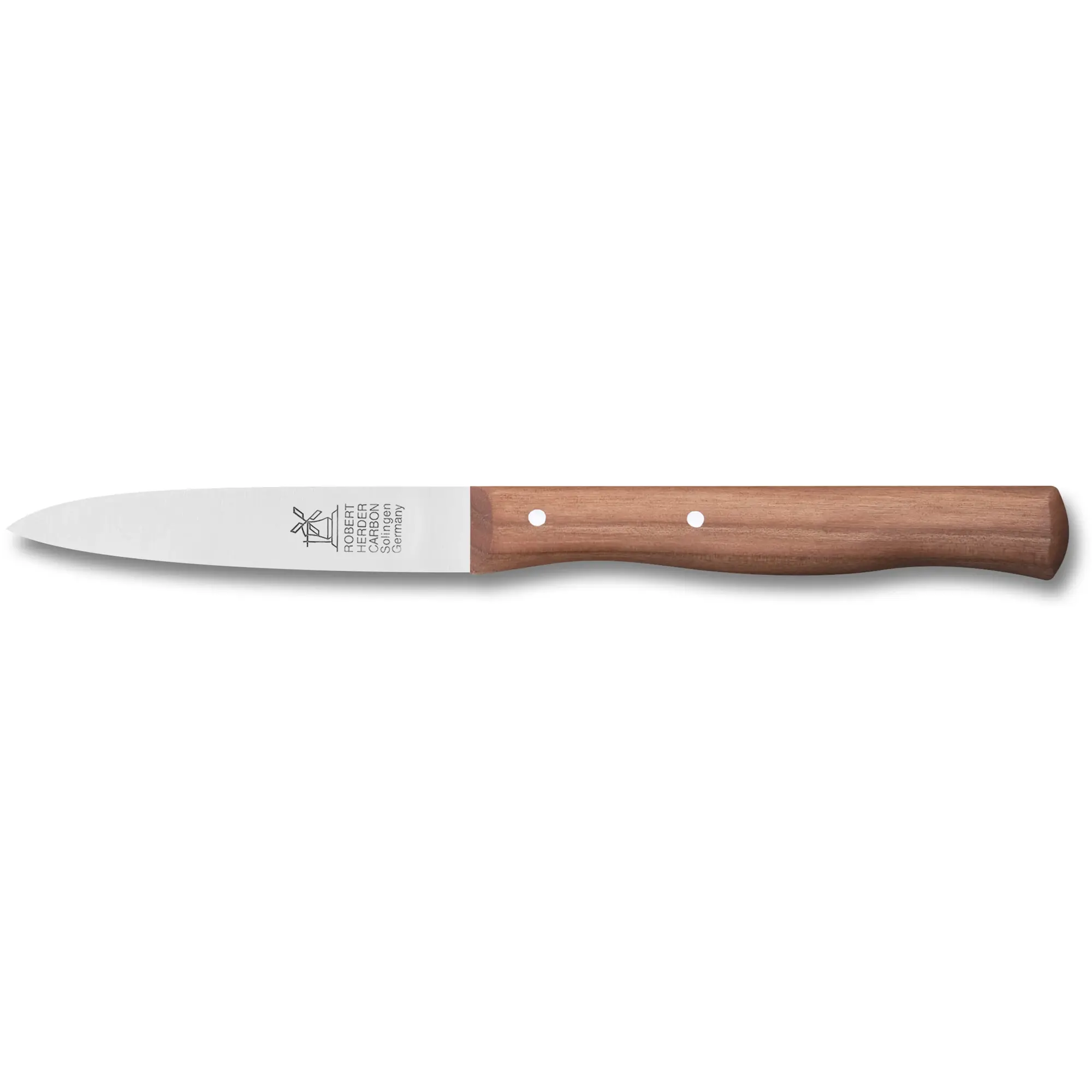 Het handgeslepen carbonstalen lemmet wordt volgens de traditionele Solinger Dünnschliff-methode uitzonderlijk dun uitgeslepen. Daardoor snijdt het mes moeiteloos, met minimale weerstand en maximale controle. De middenspits geeft extra precisie bij delicate handelingen en maakt dit mes bijzonder veelzijdig in dagelijks gebruik.