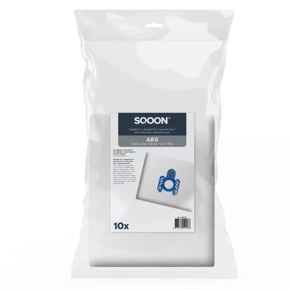 De SQOON stofzuigerzakken geschikt voor AEG GR.28 5000-serie zijn het ideale alternatief voor de originele AEG GR28 zakken. Ze bieden dezelfde pasvorm en prestaties, maar met een uitstekende prijs-kwaliteitverhouding. De verpakking bevat 10 synthetische stofzuigerzakken, ontworpen voor optimale stofopname en langdurige prestaties.