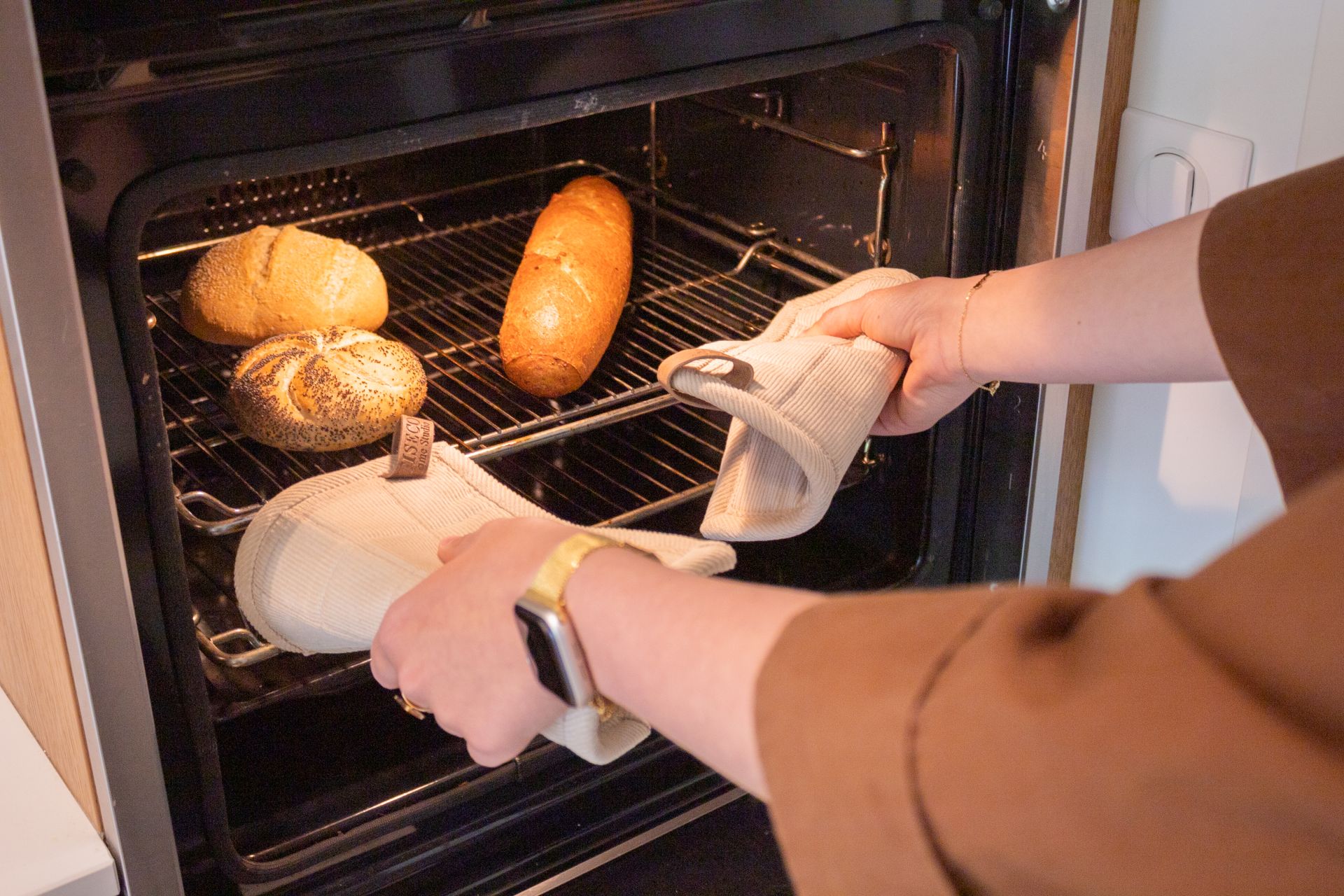 De doorgestikte ruitstructuur geeft de stof niet alleen een verfijnde uitstraling, maar versterkt ook de isolerende werking. Dankzij de dikke, hittebestendige voering blijven je handen optimaal beschermd tijdens het koken en bakken.
