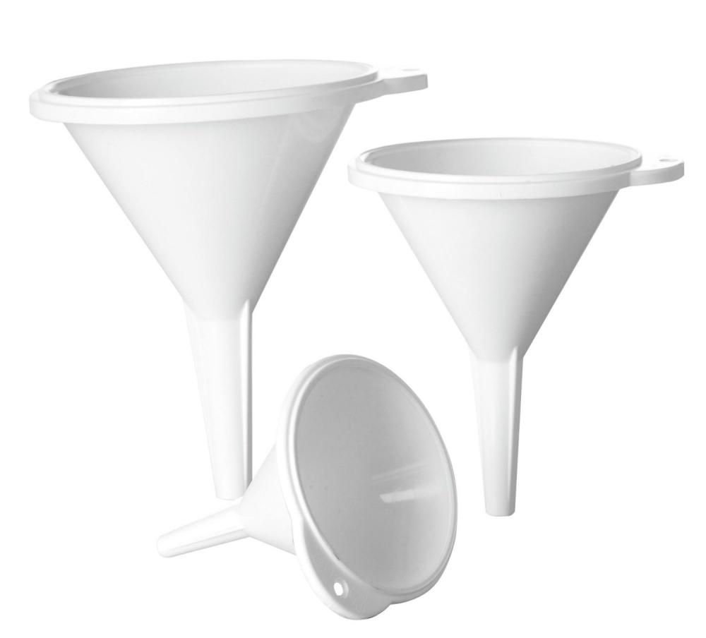 Deze trechters zitten in één set van drie verschillende maten. Ideaal voor het vullen van flessen, grasmachine,...