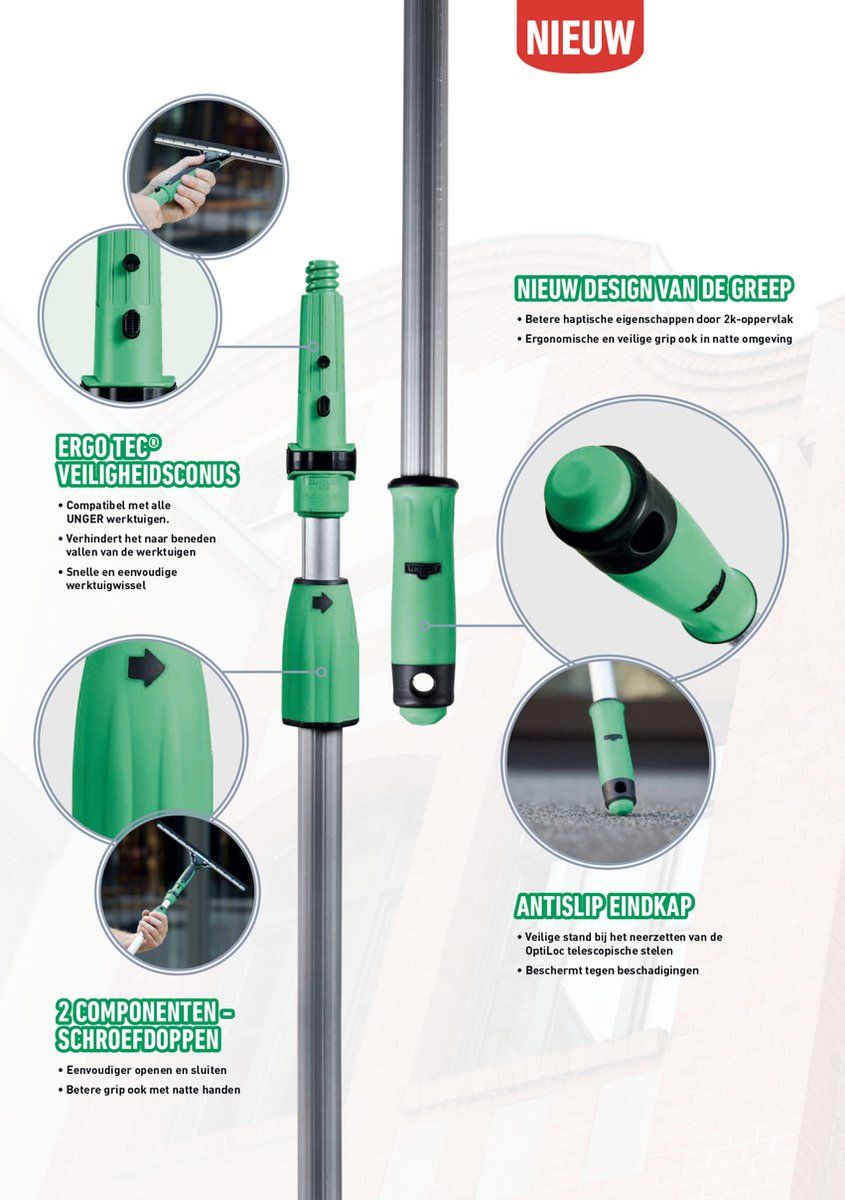 Met de Unger OptiLoc 2-delige telescoopsteel (4 m) reinig je snel, veilig en professioneel op hoogte — zonder ladder. Ideaal voor ramen, gevels, zonnepanelen, vrachtwagens, rolluiken en meer. Deze telescoopsteel is gemaakt uit licht maar sterk aluminium, waardoor je comfortabel en efficiënt kunt werken. Uitgerust met de Unger ErgoTec veiligheidsconus, die voorkomt dat gereedschap kan loskomen of vallen: perfect voor professionele glasbewassing. De ergonomische handgrepen bieden maximale controle, zelfs met natte handen, en dankzij de snelle ontgrendelknop wissel je eenvoudig tussen raamwisser, inwasser, borstel of stoffer.