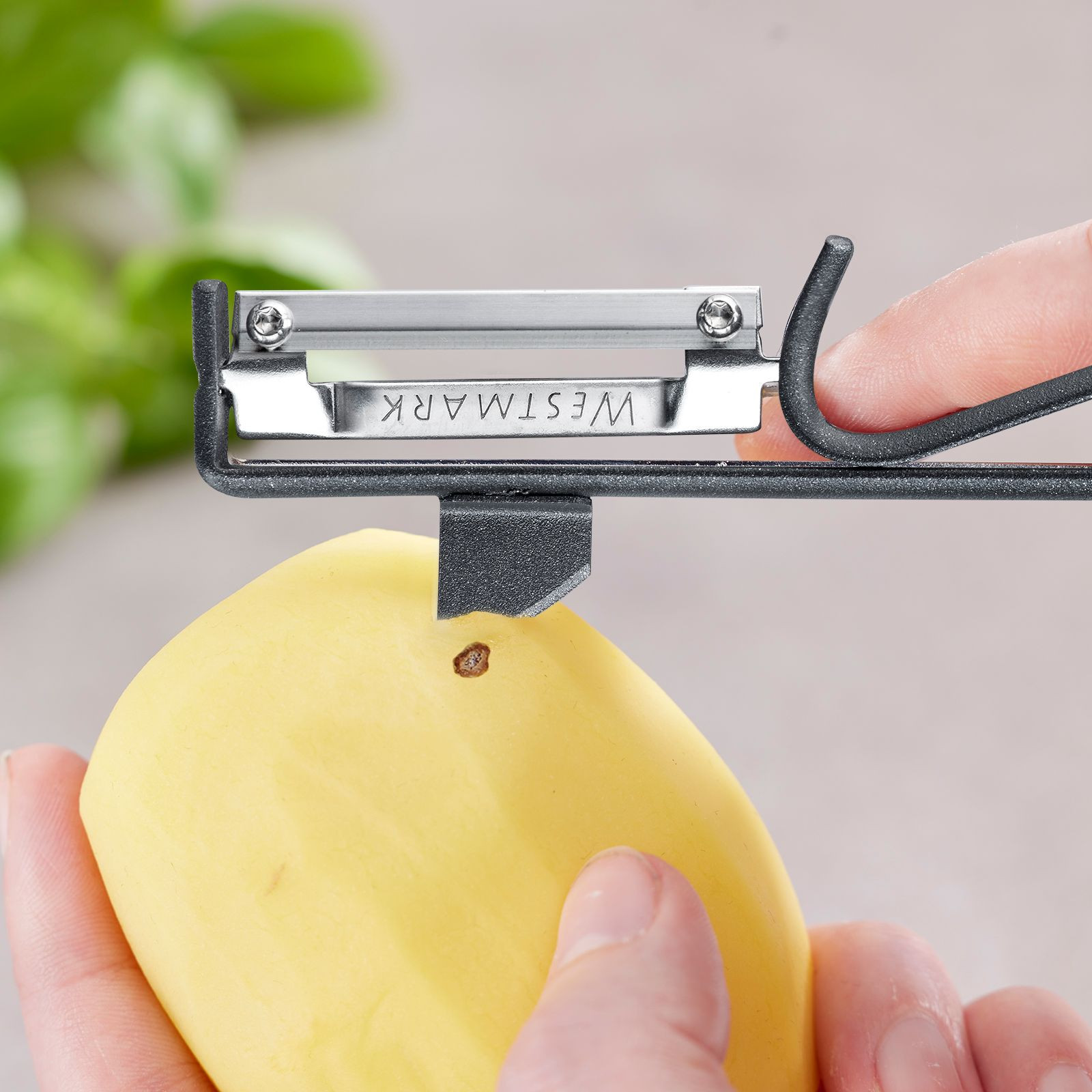 De klassieker, maar dan in een stijlvolle zwarte uitvoering. De Westmark Draaibare Dunschiller Black Edition combineert traditioneel vakmanschap met modern design en extra grip. Dankzij het draaibare, vastgeschroefde mes schilt u moeiteloos aardappelen, wortelen, komkommers en andere groenten met minimale weerstand. Het scherpe RVS-mes volgt perfect de vorm van het ingrediënt, zodat u dun en efficiënt schilt – zonder onnodig verlies. De speciale zwarte coating zorgt voor extra grip en controle, zelfs bij natte handen. De geïntegreerde, geslepen kern verwijderaar is ideaal om beschadigde plekjes of ogen snel weg te werken.