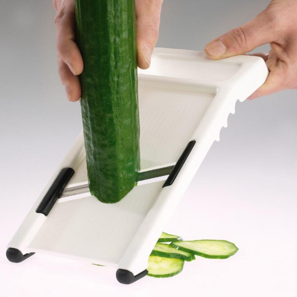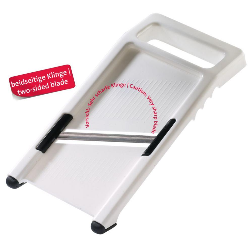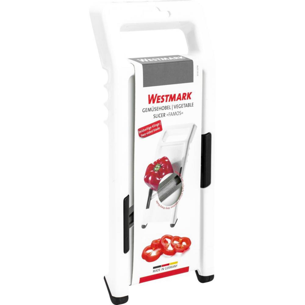 Met de Famos groentesnijder snijd je moeiteloos en snel aardappelen, appels, uien en komkommers in dunne, gelijkmatige plakjes. Het zeer scherpe, dubbelzijdige snijmes van roestvrij staal zorgt met weinig moeite voor een perfect snijresultaat. De steunnokken zorgen voor een stevige grip op pannen en schalen en dankzij de grote handgreep van hoogwaardig kunststof en de slipvaste rubberen voetjes kunt u altijd veilig werken.