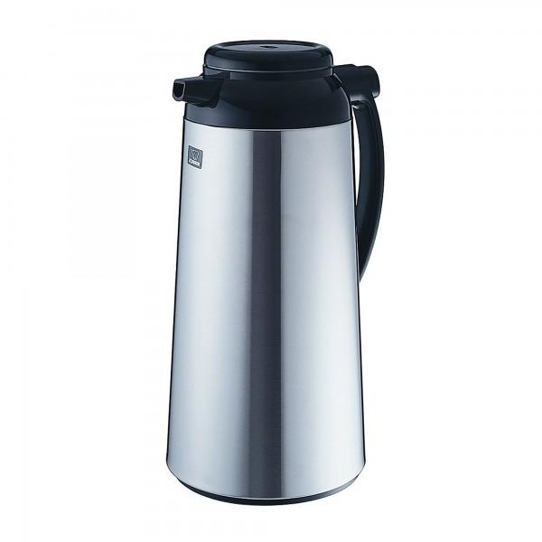 Deze isoleerkan met roestvrijstalen behuizing is voorzien van een comfortabel handvat. De thermoskan heeft een dubbelwandige glazen binnenfles voor een optimale warmteretentie. Bediening met drukknop op het handvat. Het deksel opent door dit los te draaien voor gemakkelijk te vullen en te reinigen. Deze koffiekan houdt uw warme dranken 12 uur warm en koude dranken 24 uur koud.