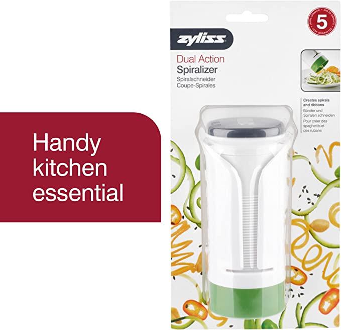 De Zyliss groenten spiraalsnijder maakt perfecte linten en spiralen van je favoriete groenten. Steek gewoon de groente in de bovenkant en draai het handvat naar beneden terwijl je vanaf de zijkanten druk uitoefent. Het proces beschermt uw handen en vingers tegen de messen. Beide messen kunnen in het onderste compartiment worden opgeborgen voor meer ruimte in de lade.