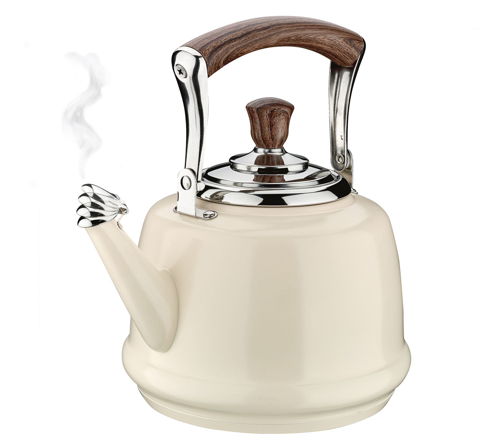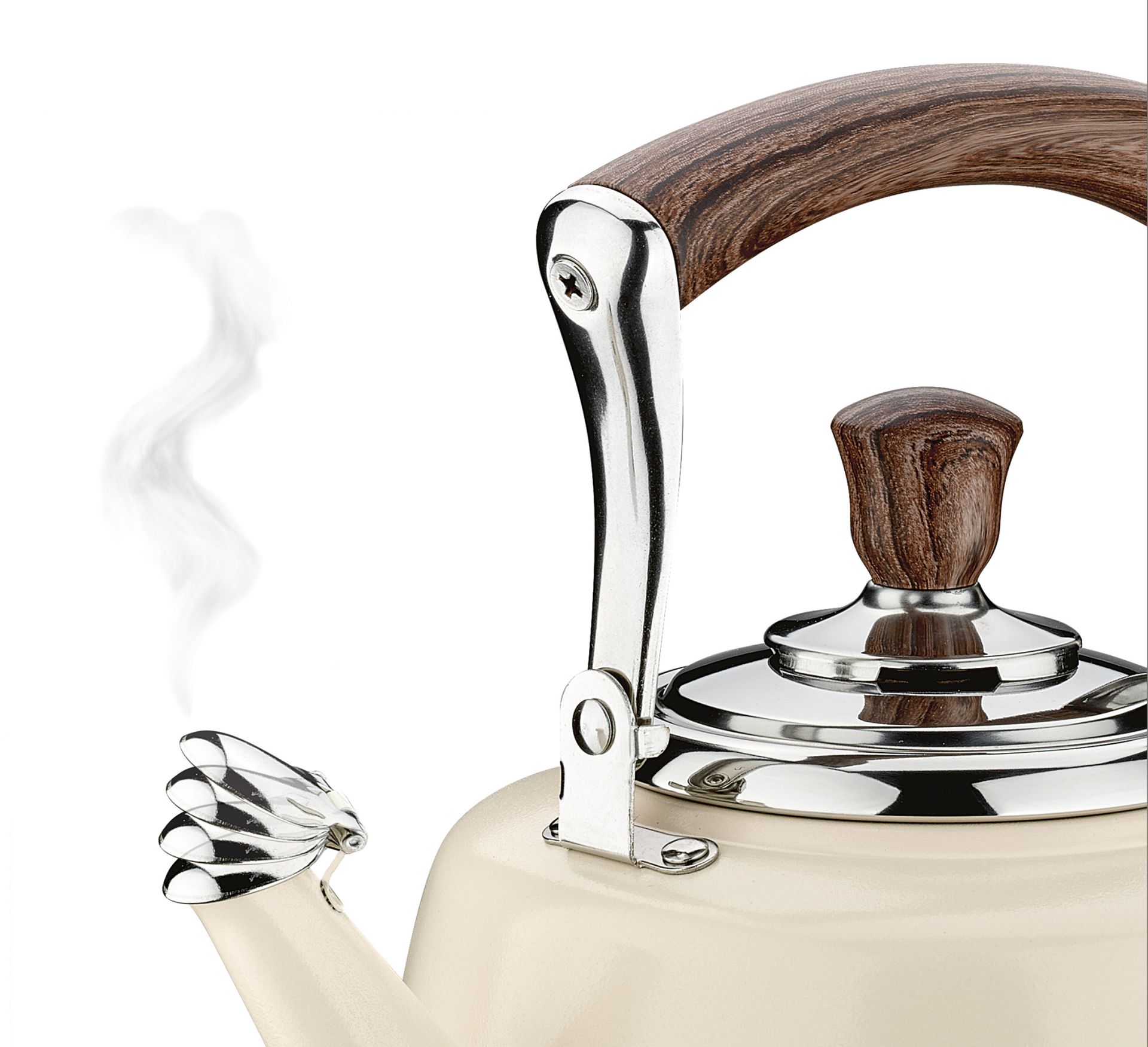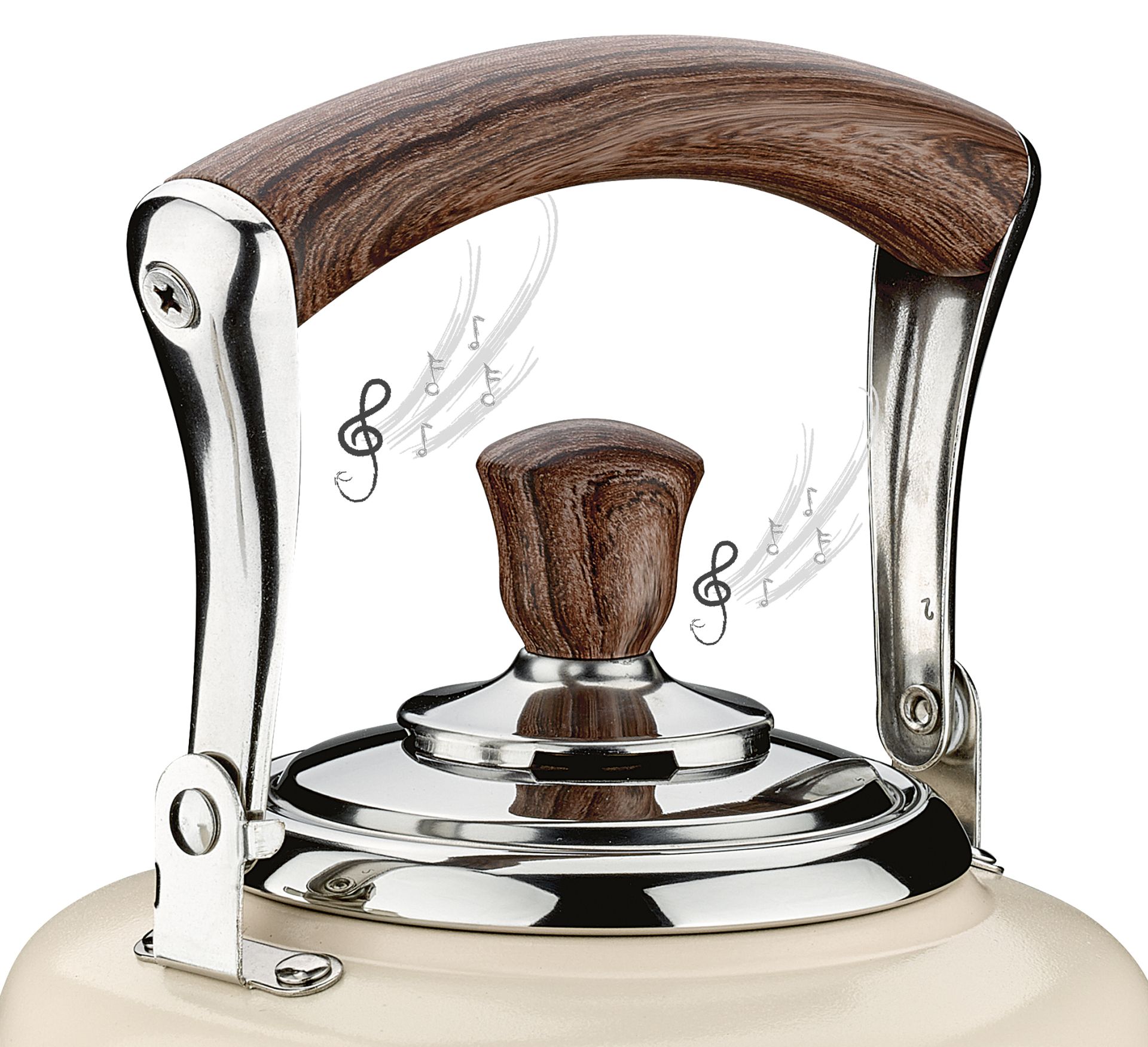 Sa base capsule compatible induction (Ø 14,5 cm) assure une chauffe rapide et uniforme sur toutes les plaques de cuisson. Lorsque l’eau atteint l’ébullition, une flûte harmonieuse à deux tons retentit depuis le couvercle – un détail subtil et élégant.