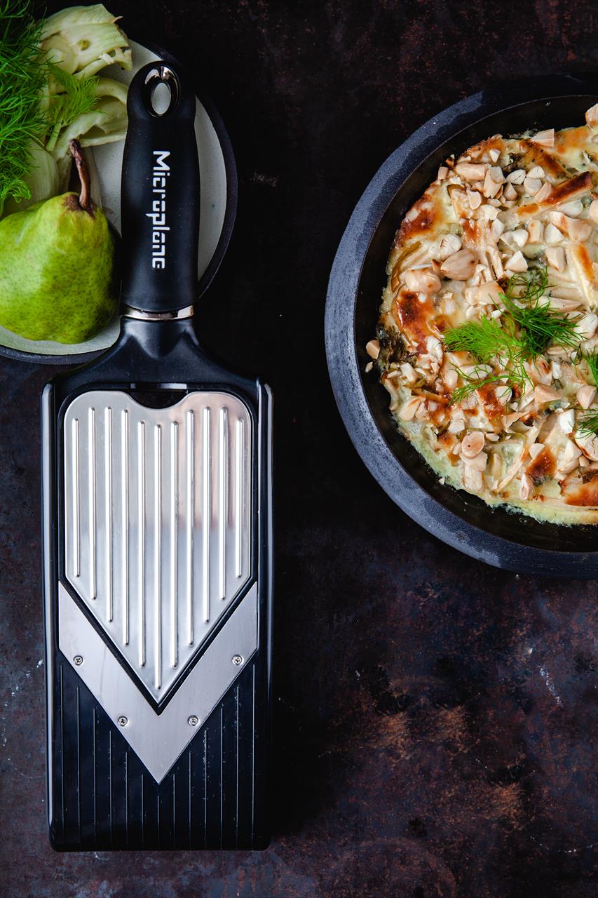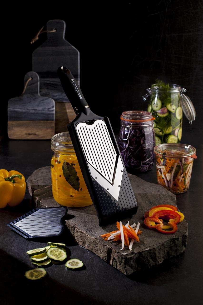 Trancheur Microplane® à lame en V réglable avec fonction julienne - Précision et polyvalence en un seul outil