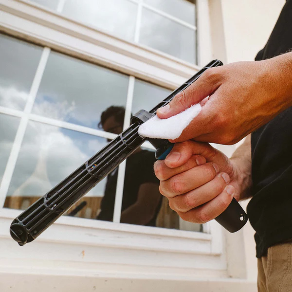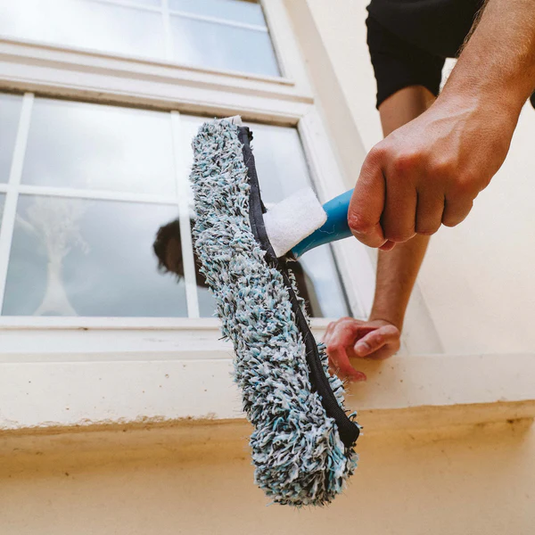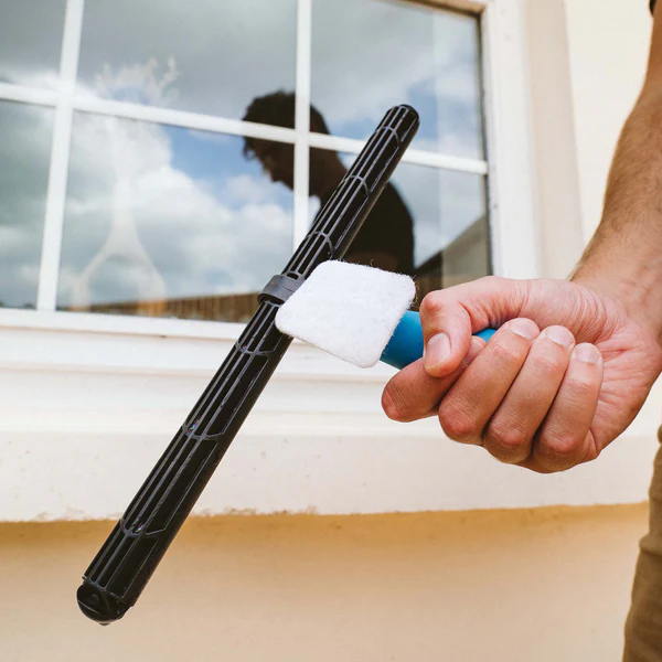 Tampon à récurer Moerman pour cliquer sur les pièces du transporteur Moerman. Le Moerman scrubber est petit mais efficace : fixez-le au niveau de la poignée, sous le Moerman scrubber (les deux ne sont pas inclus) et vous pouvez vous mettre au travail ! La combinaison d'une brosse et d'un pulvérisateur permet d'éliminer les salissures grossières directement, de manière ciblée et rapide, en mouillant la surface du verre. Il suffit d'appuyer le tampon à récurer sur la fenêtre avec le doigt et de le déplacer.